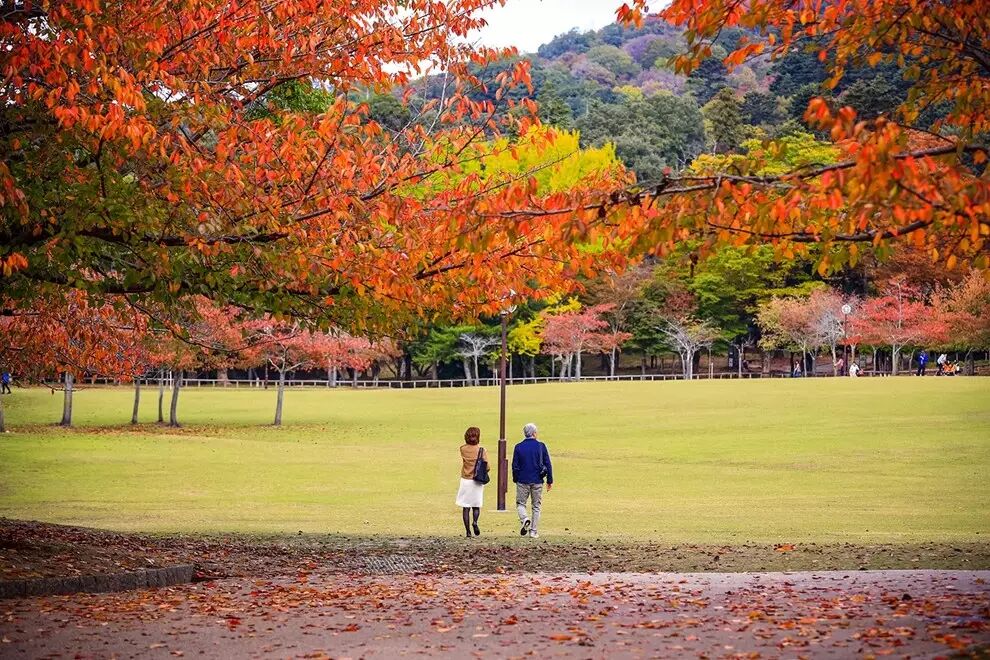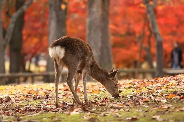 秋季满园枫叶的奈良公园令人心旷神怡,在东西约4公里、南北约2公里的公园里,随处可见成群的梅花鹿,与它们亲密接触是旅行到此的一大乐趣。
